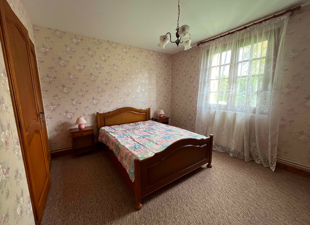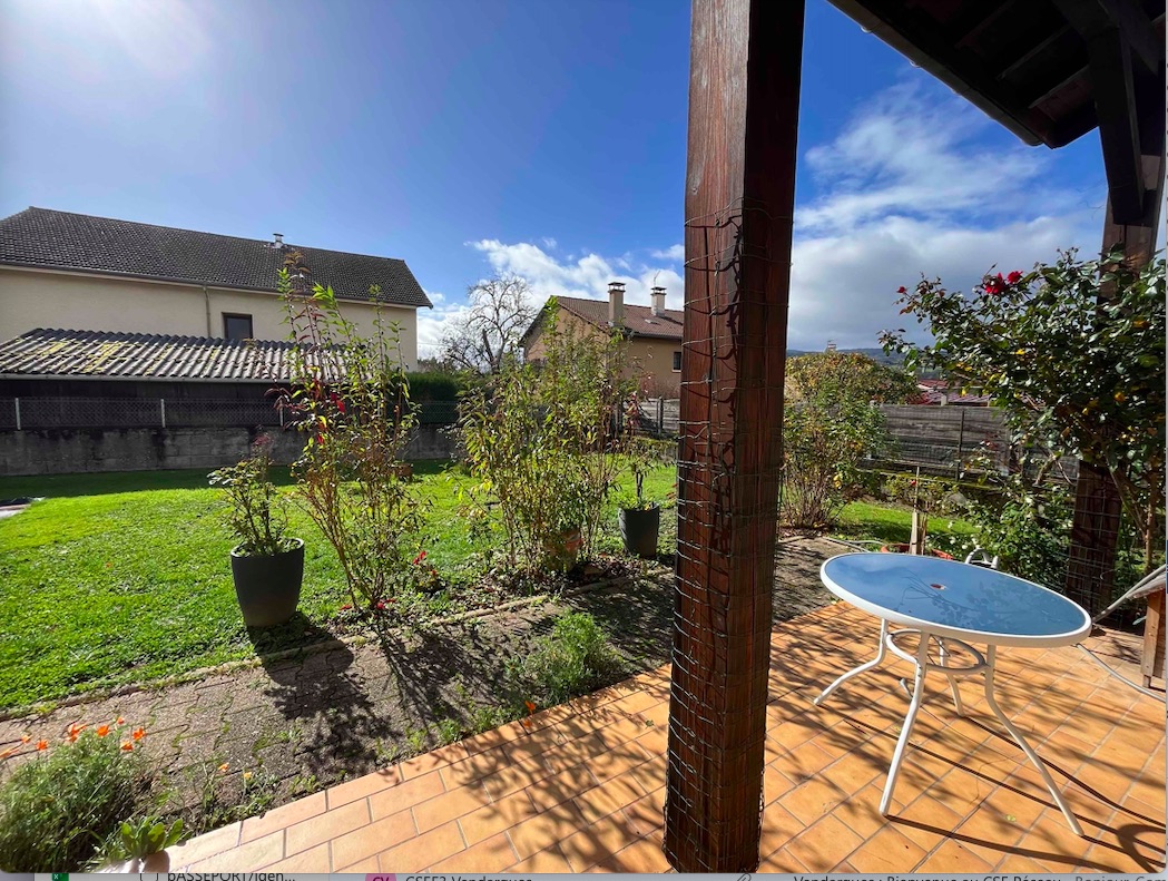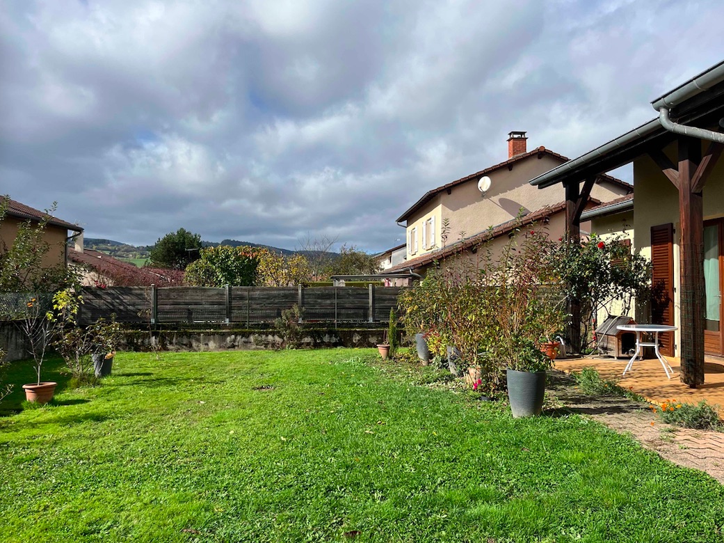 Maison de plein pied orientée sud avec un grand jardin et une terrasse.